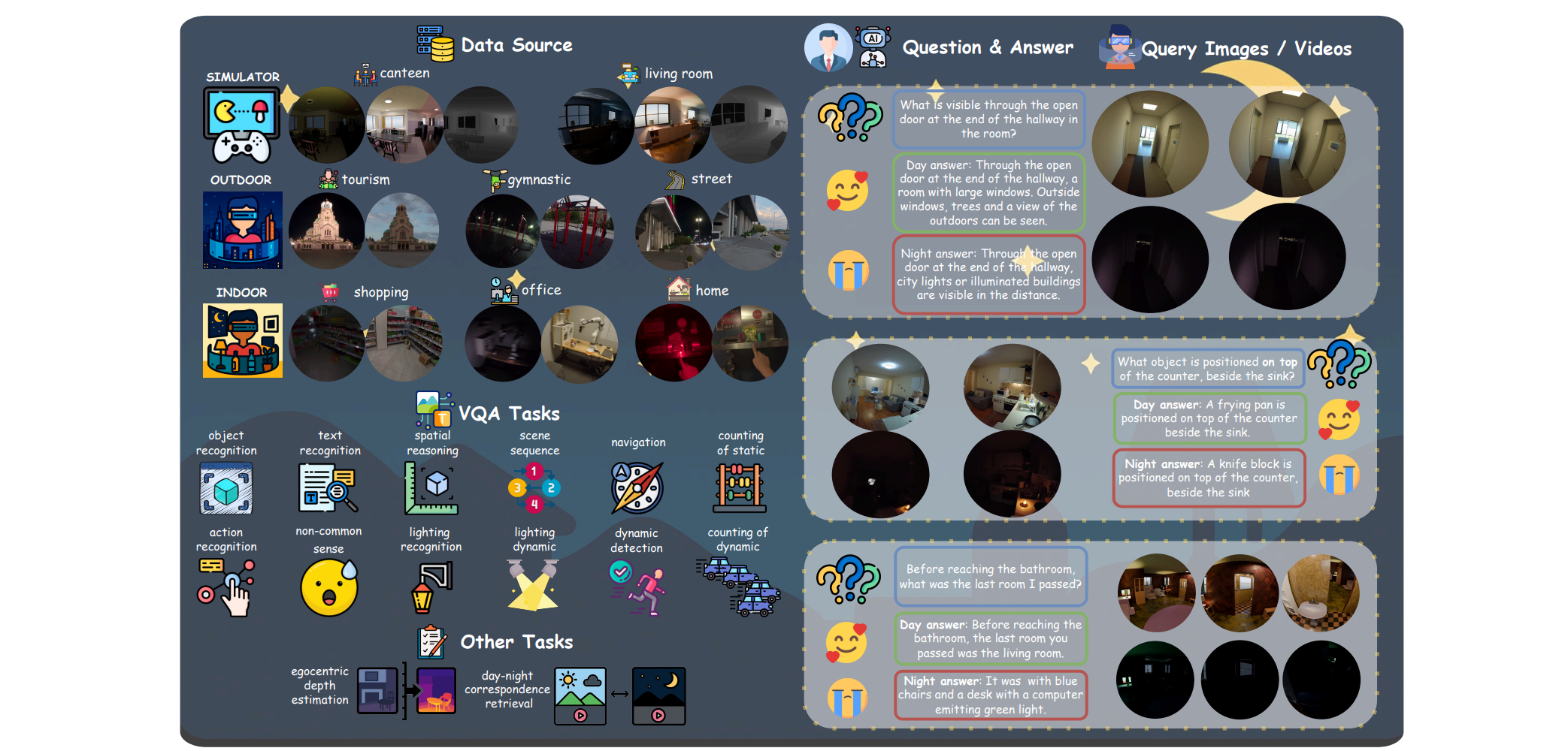![]() ![]() | Deheng Zhang*, Yuqian Fu*, Runyi Yang, Yang Miao, Tianwen Qian, Xu Zheng, Guolei Sun, Ajad Chhatkuli, Xuanjing Huang, Yu-Gang Jiang, Luc Van Gool, Danda Pani Paudel ICLR 2026 Paper EgoNight is the first comprehensive benchmark designed to evaluate egocentric vision understanding in low-light and nighttime conditions—a critical gap in current research. The suite features a diverse dataset comprising synthetic scenes (EgoNight-Synthetic), real-world aligned day-night pairs (EgoNight-Sofia), and unaligned nighttime footage (EgoNight-Oxford). |